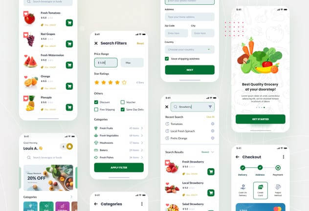 通过使用干净整洁的外观进行设计,并使用绿色作为主要颜色,它为使用该应用程序的任何人提供了令人耳目一新的感觉。该杂货店应用程序模板的每个软件包均由以下15个页面组成:演练,登录和注册,首页,搜索过滤器,搜索结果,产品,产品详细信息,购物图,送货地址,付款表格,我的订单和跟踪订单。