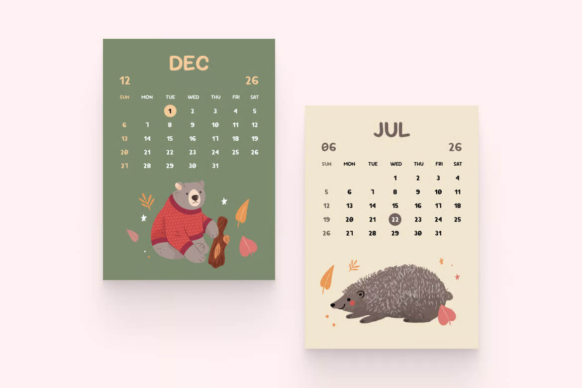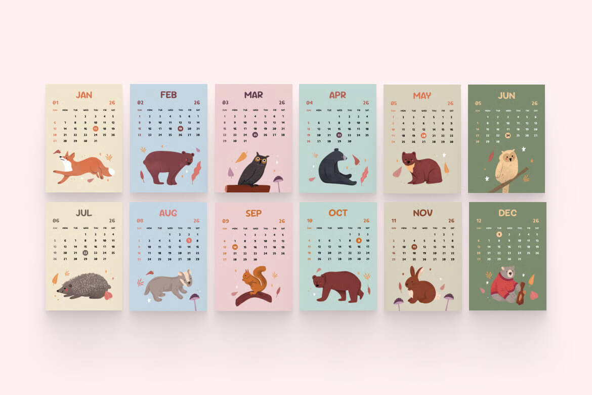 这款2026年动物日历设计模板巧妙融合了活泼的手绘动物插画、柔和的大地色调和简洁的设计,非常适合儿童卧室、教室或舒适的工作空间。每个月都以不同的可爱动物为主题,让每日计划充满乐趣。该模板提供AI和EPS格式,可编辑,可直接打印,并采用分层设计,方便您进行个性化定制。