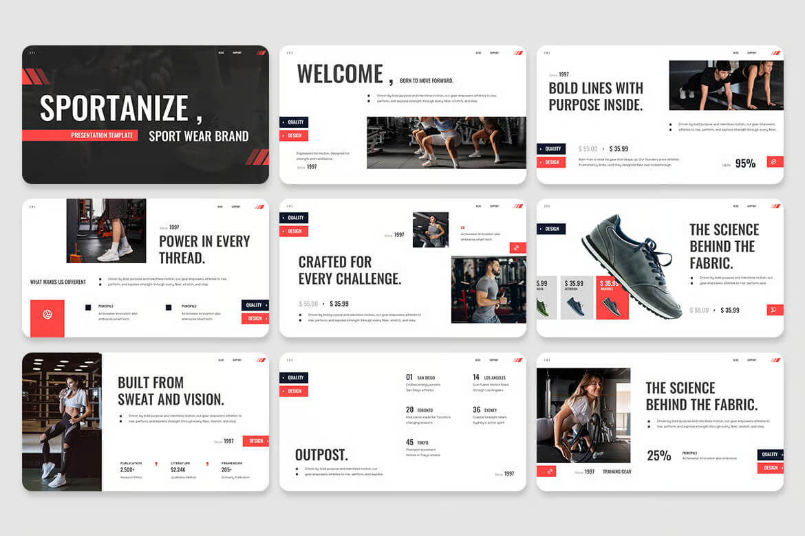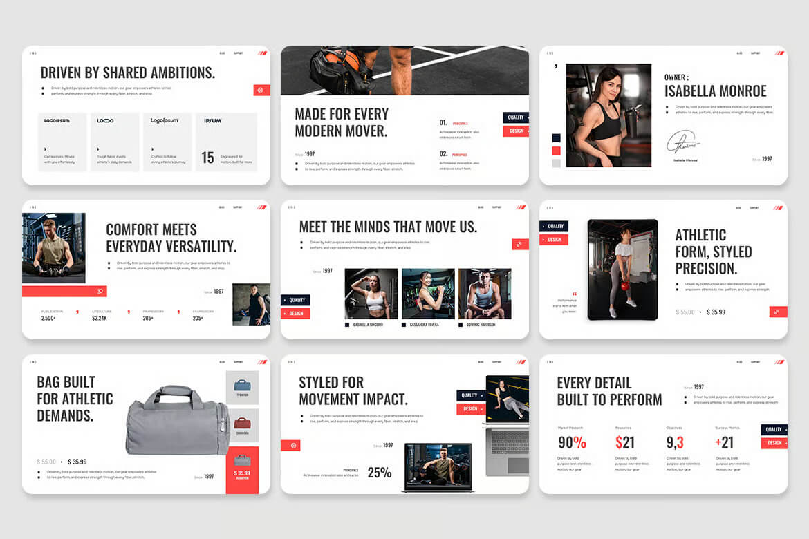 这款运动服装品牌展示模板简洁明了、充满活力,并注重实用性,旨在提升任何运动服装品牌、健身初创公司或积极生活方式公司的形象。该模板采用现代美学设计和精心平衡的字体排版,助您自信地讲述引人入胜的品牌故事,并带来震撼的视觉效果。
