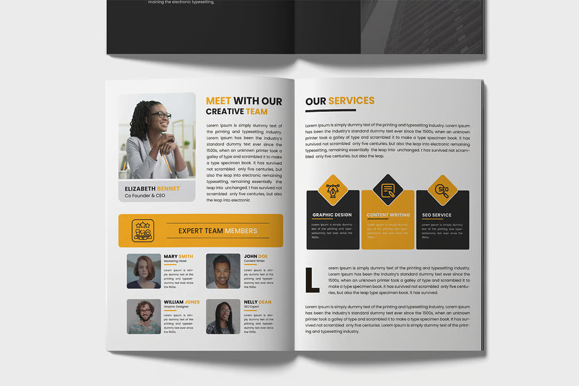 创新型 InDesign 公司简介手册设计。布局简洁现代,风格极简。可根据您的喜好进行自定义。轻松更改颜色、自由文本字体、形状、调整大小等。这是一款专业优雅的多用途印刷就绪模板。